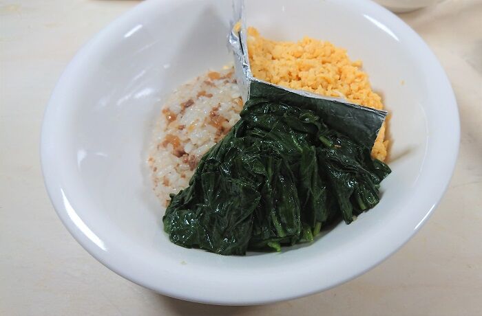- 水気を切ったほうれん草を【水で薄めためんつゆ】で洗う。