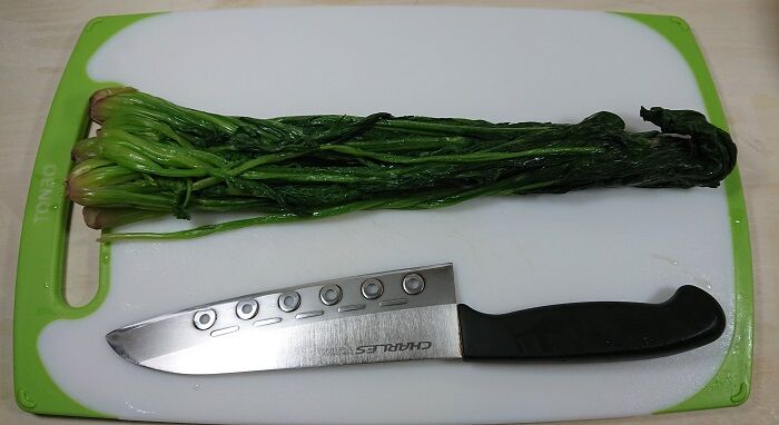 - 沸いたお湯に、茎の部分をつけて1分茹でる。