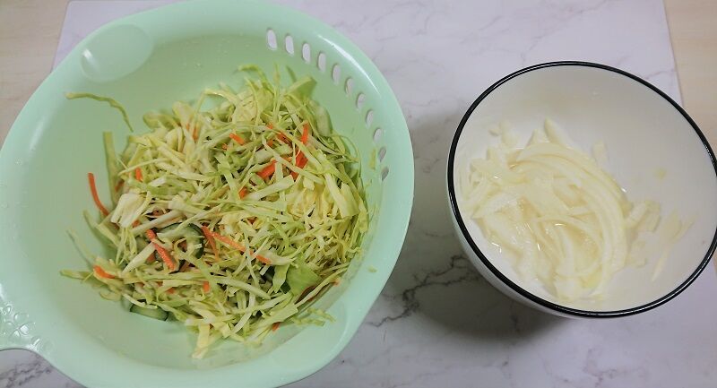 1.具材を切って塩をすこしふってから水切りをする。2.玉ねぎは細切りにしてからすし酢に漬ける。