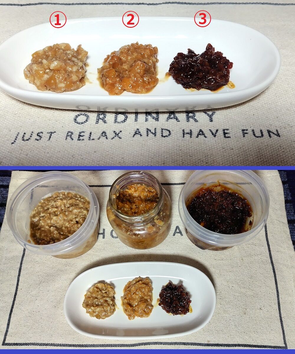 ③は発酵温度も時間も長かったので、味噌の雰囲気に近い納豆の味です。
